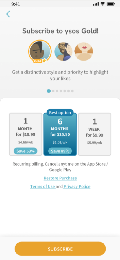 Users who subscribe to Ysos GOLD plan increase their chances of success, become prominent among other users, and also have access to unlimited likes!