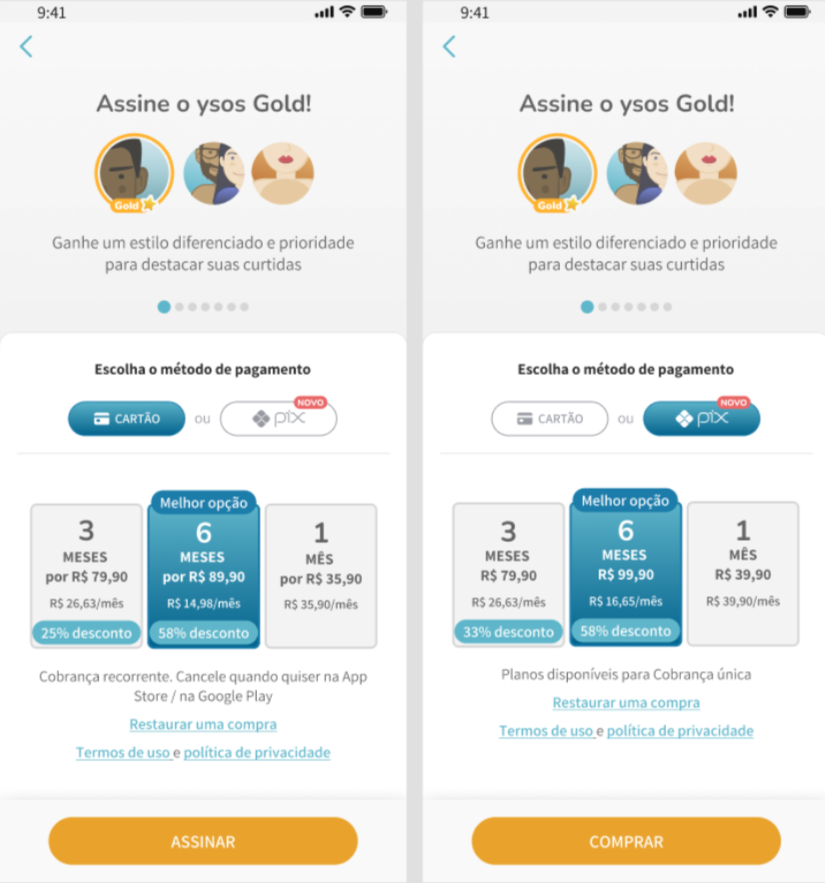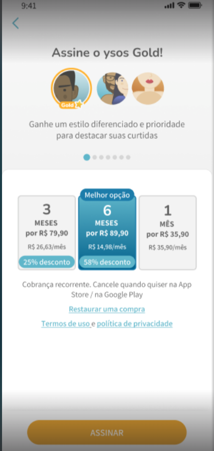 Quem assina o plano GOLD do Ysos aumenta as chances de sucesso, consegue ser destaque entre os outros usuários e ainda conta com curtidas ilimitadas!